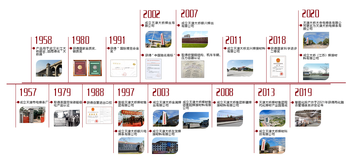 天津市電焊條廠創(chuàng)建于1957年。1958年,共和國橫跨長江的第一座大橋——武漢長江大橋選用天津市電焊條廠焊材,這是國產(chǎn)焊條首次應(yīng)用在國家重點(diǎn)工程中,“大橋牌”由此誕生。1997年,天津市鈦鐵實(shí)業(yè)總公司與天津市電焊條廠實(shí)行股份制重組,正式創(chuàng)立天津大橋焊材集團(tuán)有限公司。